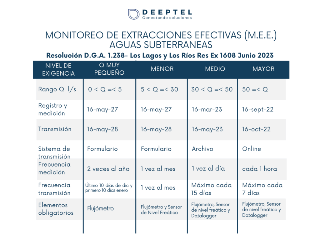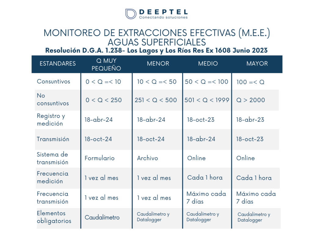 Subterráneas: las exigencias son diferenciadas según el caudal total autorizado en una obra. A mayor caudal total, mayor será la exigencia para el titular. Los titulares de Derechos de Aprovechamiento de Aguas deberán instalar el Sistema de Medición y Transmisión de alguno de los niveles de exigencia (estándar) señalados en resolución D.G.A. (Exenta) N° 1238 de 21 de junio de 2019, que son los siguientes: Caudales Muy Pequeños, Menor, Medio y Mayor. El estándar que le corresponda a cada usuario dependerá del caudal total autorizado en la obra y el rango de caudales que definen los estándares está indicado en la Resolución D.G.A. Regional correspondiente al territorio de su obra.
